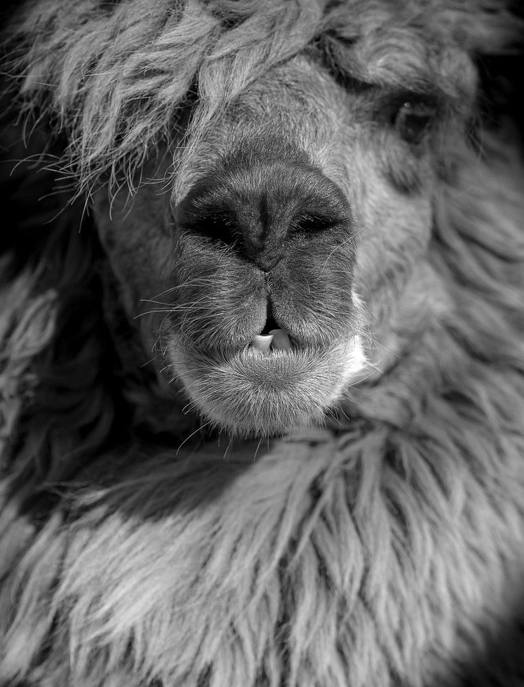 Bestelle dieses Porträt Black n White Lama von Fabian Elsing als Reproduktion auf Leinwand, Alu-Dibond, als Poster, Fototapete oder Acrylglasbild.