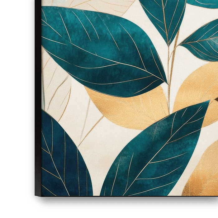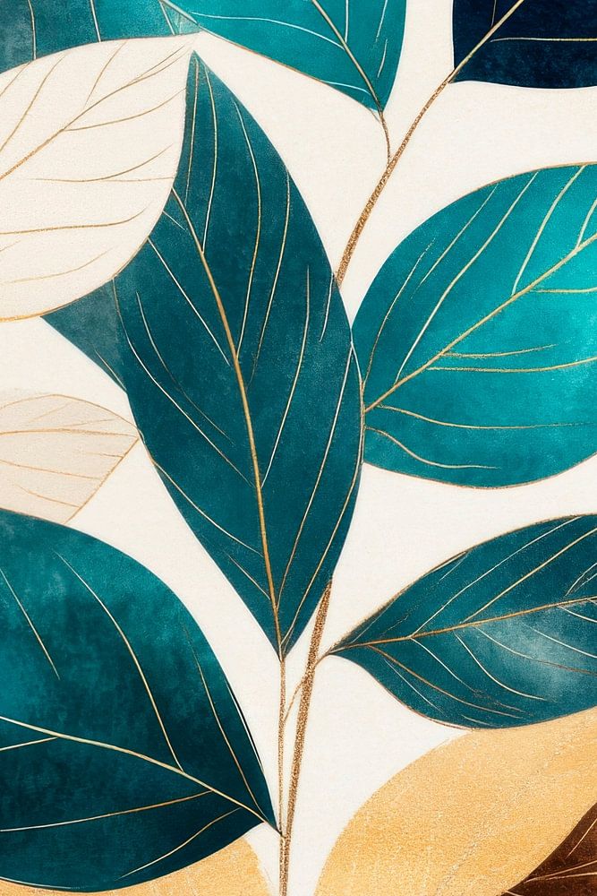 Ein harmonisches Zusammenspiel aus tiefen Teal-Tönen, sanften Cremefarben und warmen Erdfarben entfaltet sich in einer eleganten Anordnung von stilisierten Blättern. Die geschwungenen Formen und feinen Aderungen schaffen eine lebendige Tiefe, während der Hintergrund in sanften Nuancen verblasst und dem natürlichen Motiv einen zeitlosen,…