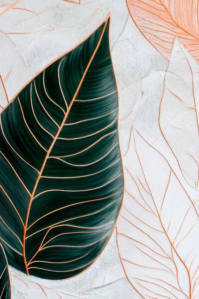 Ein Spiel aus sattgrünen und zarten, hellen Blättern entfaltet sich auf der Oberfläche. Die filigranen Adern der dunklen Blätter kontrastieren elegant mit dem sanften, fast ätherischen Hintergrund. Diese harmonische Komposition zieht den Betrachter in eine naturnahe Oase, wo jede Blattstruktur Geschichten von Wachstum und Vitalität erzählt.
