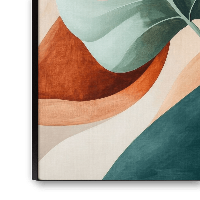 Sanfte, organische Formen und eine lebendige Blattdarstellung verschmelzen harmonisch mit erdigen Tönen. Diese lebendige Komposition bringt ein Gefühl von Frische und Natur ins Raumklima. Ideal für das Wohnzimmer, vermittelt sie eine entspannte Atmosphäre und lädt zum Verweilen ein, während sie den Raum mit einem Hauch von Kreativität bereichert.