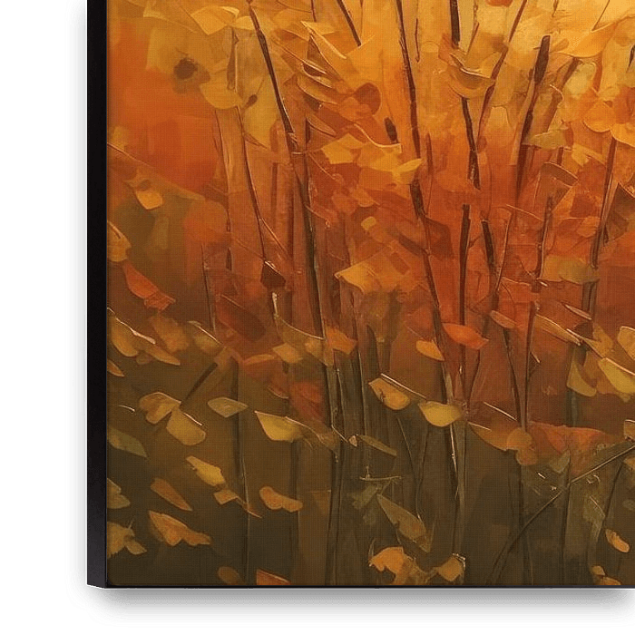Dieses Gemälde zeigt eine phantasievolle Herbstszene, in der es scheint, als ob der Wind mit den fallenden Blättern spielt und sie in einem goldenen Ballett vor einem beruhigenden Himmel aufrichtet.