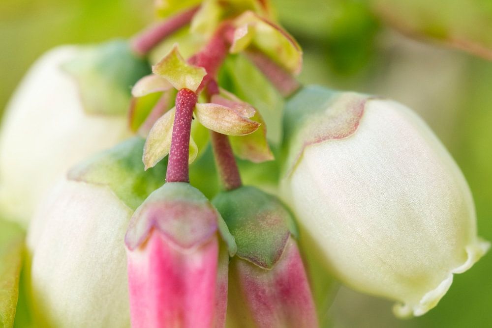 Blueberry Blossom On Green II - Die winzige Heidelbeerblüte wächst in dichten Büscheln. Die Knospen der Heidelbeere sind zunächst grün und verfärben sich dann in ein dunkles, leuchtendes Magenta-Rosa. Wenn die Blüte reift und sich öffnet, verwandelt sie sich in eine zarte cremeweiße glockenförmige Blüte. Ein Büschel zarter glockenförmiger Blüten und Knospen hängt anmutig von einer Pflanze herab. Die Knospen weisen einen schönen Farbverlauf von Grün zu Rosa auf, während die Blüten ein zartes Cremeweiß mit einem Hauch von Grün sind.
