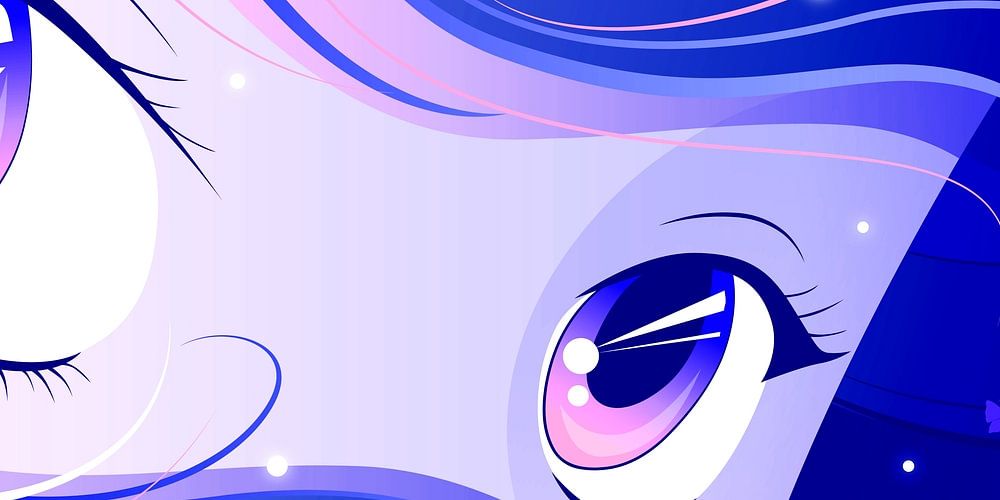 Dieses Werk zeigt eine Nahaufnahme zweier großer, stilisierter Augen im Anime-Stil, die in Blau- und Violetttönen gehalten sind. Die Iris ist detailliert ausgearbeitet und reflektiert Licht, was den Augen eine fast gläserne Tiefe verleiht. Umrahmt wird das Gesicht von fließenden, wellenartigen Linien, die an Haarsträhnen erinnern und sich farblich harmonisch in das Gesamtbild einfügen. Der Hintergrund ist mit kleinen weißen Punkten und stilisierten Schmetterlingsformen versehen, was dem Bild eine verspielte, fast traumartige Atmosphäre verleiht.