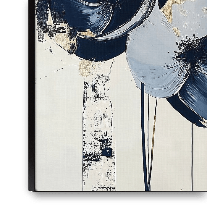 Blue Flowers | Blue Dazzle - Dieses Blumenbild zeigt drei große, stilisierte blaue Blumen mit goldenen und schwarzen Akzenten auf einem Hintergrund mit weißen, beigen und schwarzen Pinselstrichen.