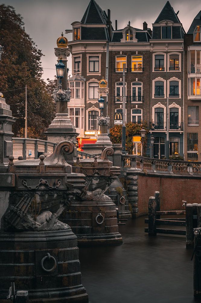 Das Foto wurde vom Fluss Amstel aus aufgenommen und zeigt die stimmungsvolle Umgebung mit der Blauwbrug im Bild. Dank der langen Verschlusszeit von 90 Sekunden werden bewegte Elemente wie das Wasser der Amstel und eventuelle Passanten unscharf abgebildet, wodurch ein ruhiger und fast traumhafter Effekt entsteht.