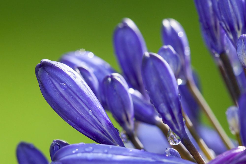 Makroaufnahme von blauen Agapanthus-Knospen mit Wassertropfen vor grünem Hintergrund