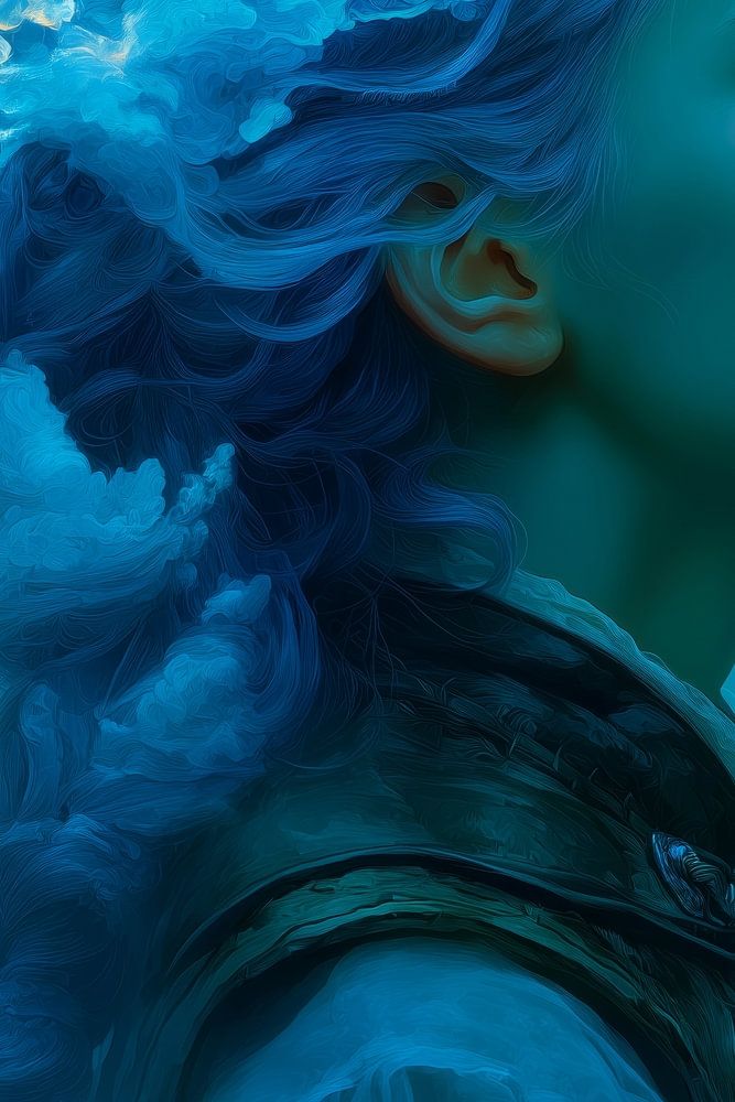 Besonders beeindruckend ist die Art, wie die Haare der Frau in die wässrige Umgebung übergehen. Sie scheinen zu schweben, zu fließen und zu tanzen, als wären sie von einer unsichtbaren Strömung erfasst. Diese Verschmelzung von Realität und Fantasie macht das Werk zu einem meditativen Erlebnis. Die Frau selbst strahlt eine tiefe Ruhe aus, als würde sie die Transformation bewusst erleben und genießen. Es ist ein Bild, das zum Träumen einlädt und die Vorstellungskraft des Betrachters beflügelt.