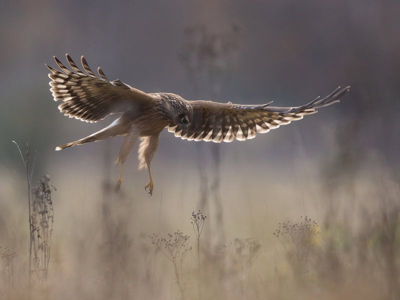 Bestelle dieses Landschafts-Wandbild Blaue Rohrweihe auf der Jagd von Hajar Bakali als Reproduktion auf Leinwand, Alu-Dibond, als Poster, Fototapete oder Acrylglasbild.