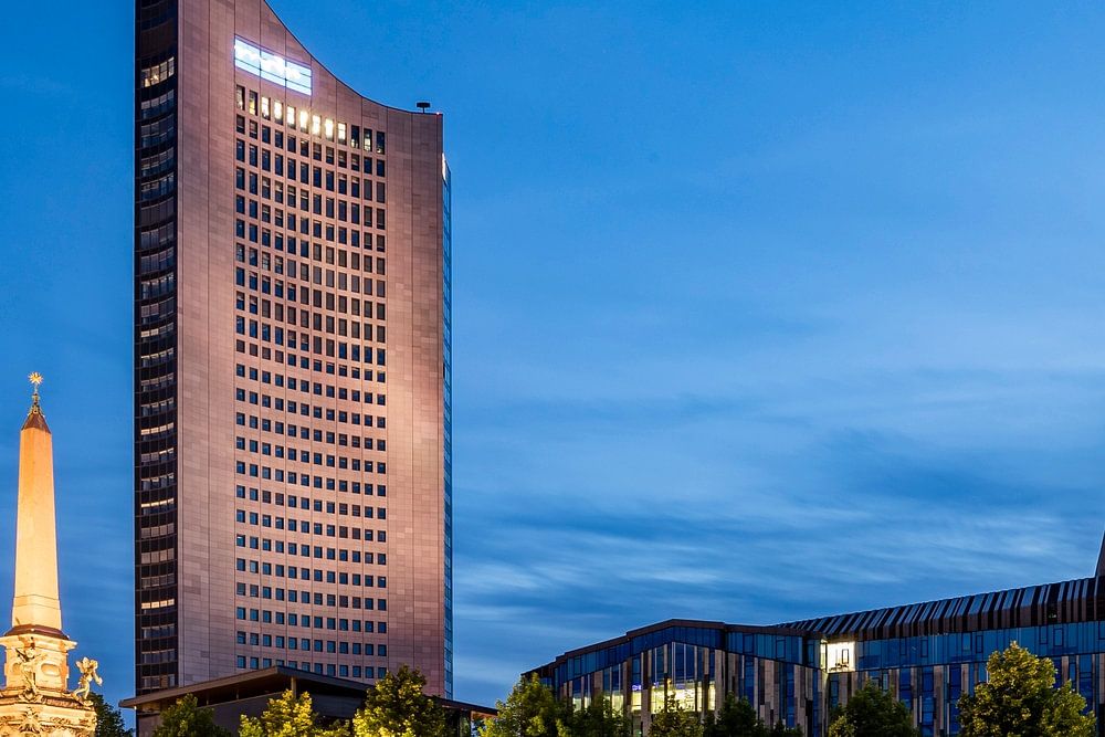 Blaue Stunde in Leipzig mit dem Gewandhaus, Mendebrunnen, City-Hochhaus, Neues Augusteum und Paulinum am Augustusplatz, Sachsen, Deutschland.