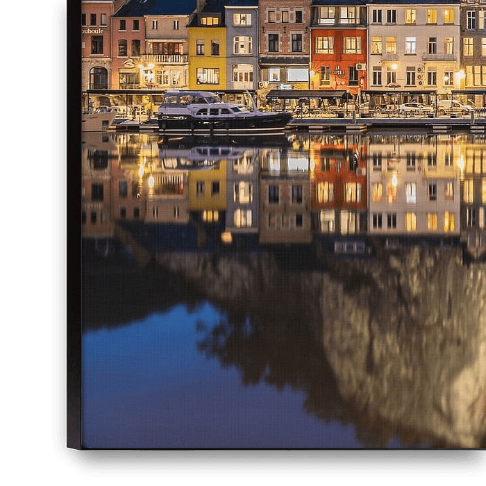 Bestelle das Foto Blaue Stunde an der ruhigen Maas in Dinant Belgien von Jeroen de Jongh Fotografie als Reproduktion auf Leinwand, Alu-Dibond, als Poster, Fototapete oder Acrylglasbild.