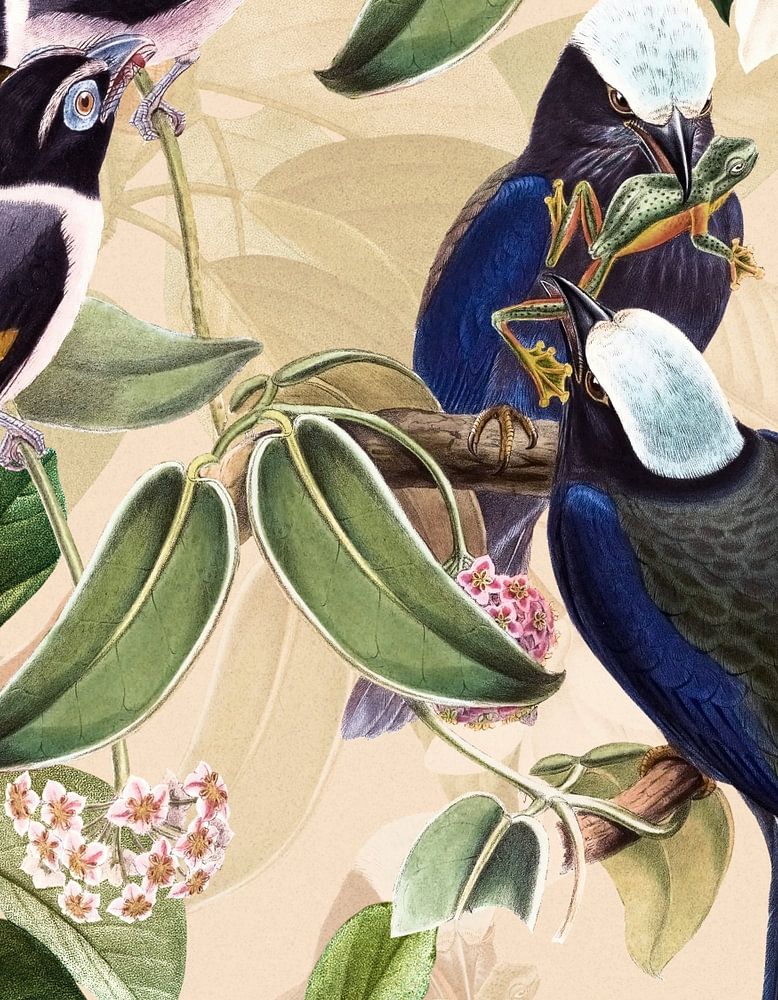 antike hand gemalte blaue tropische Vögel zwischen exotischen Zweigen von Magnolien und Blättern