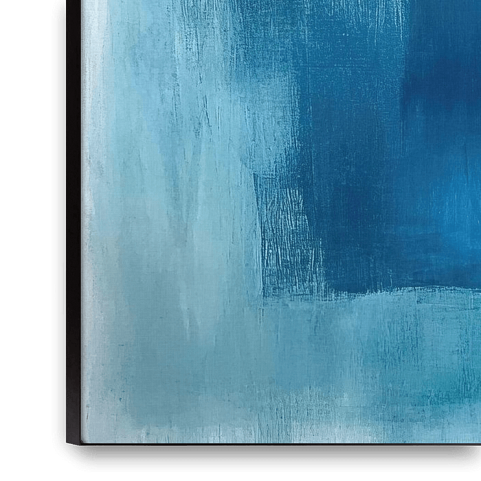 Blue Block – Dieses abstrakte Gemälde zeigt große, sich überlappende blaue Flächen und klare Quadrate in weichen, verwischten Pinselstrichen, wobei ein helles zentrales Quadrat sich deutlich von tieferem Kobalt und Türkis abhebt, perfekt als modernes abstraktes Gemälde und blaues Gemälde mit geometrischen Formen und Textur; abstraktes…