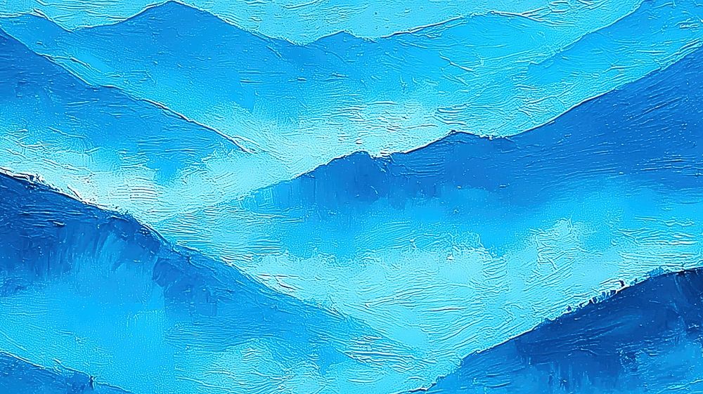 Dieses ausdrucksstarke Impasto-Ölgemälde zeigt eine eindrucksvolle blaue Berglandschaft im ersten Licht des Tages. Dichte Nebelschwaden füllen das Tal unterhalb der Gipfel und erzeugen eine geheimnisvolle Atmosphäre. Über den majestätischen Bergen kreisen Vögel in freiem Flug, während ein farbenfroher Sonnenaufgang den Himmel in leuchtende Töne von Orange, Rosa und Gold taucht.