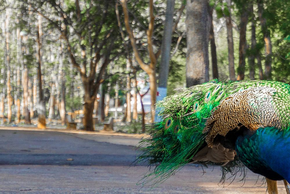 Blauer Pfau auf bei einer Tempelanlage in Thailand Lop Buri im Hintergrund ein Mönch der den Boden fegt