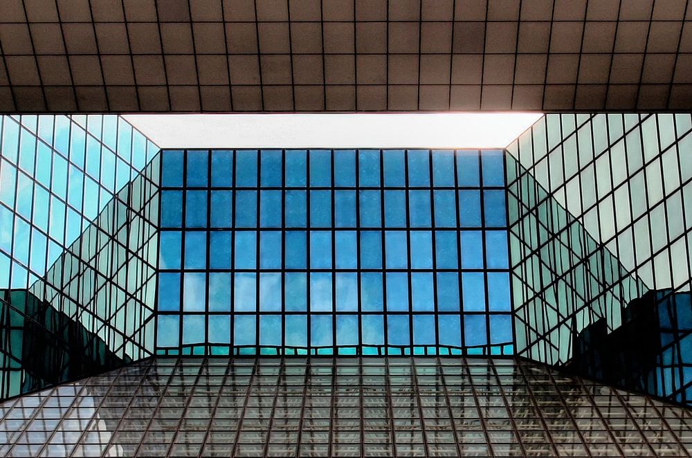Moderne Architektur in Frankreich mit blauem Glas. Das Ganze hat ein futuristisches Aussehen