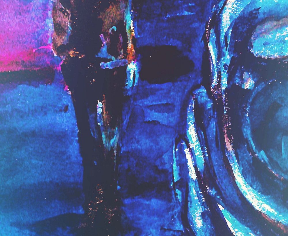 Aquarell eines blauen Volkswagens. Der Mann geht von seinem Auto weg, ist es eine Panne oder kommt er nach Hause? Es ist noch dunkel, aber die Sonne geht schon auf. Das Licht scheint ein wenig auf den VW und bringt ihn zum Leuchten. Es ist ein alter VW-Typ mit den geteilten Fenstern. Unser erstes Auto war auch einer dieser blauen VWs, die oft kaputt gingen! Es ist also ein bisschen Nostalgie für mich.