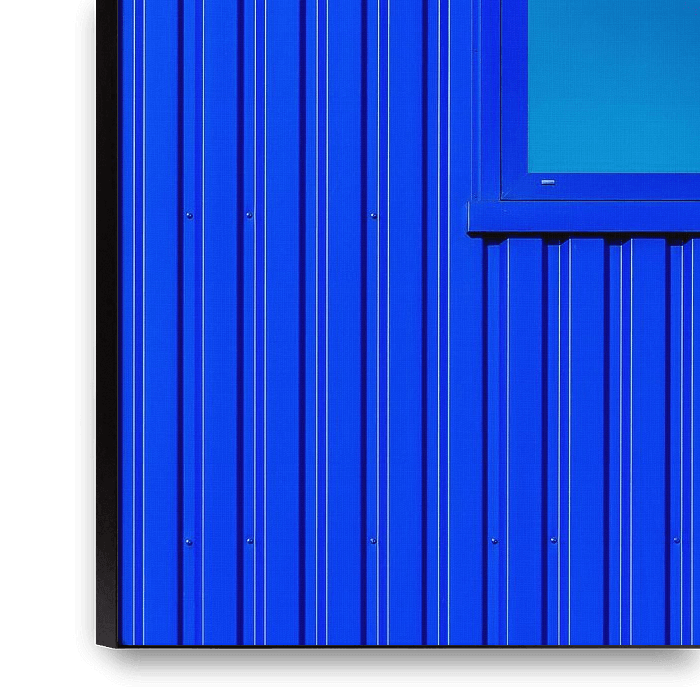 Dieses abstrakte fotografische Werk zeigt eine hellblaue Wand mit klaren, vertikalen Linien und einer mittig platzierten rechteckigen Fensteröffnung. Der obere Teil des Fensters ist hellblau, während der untere Teil in einem tieferen, dunkleren Blauton gehalten ist. Die Einfachheit und Symmetrie dieser Komposition schaffen eine visuelle…