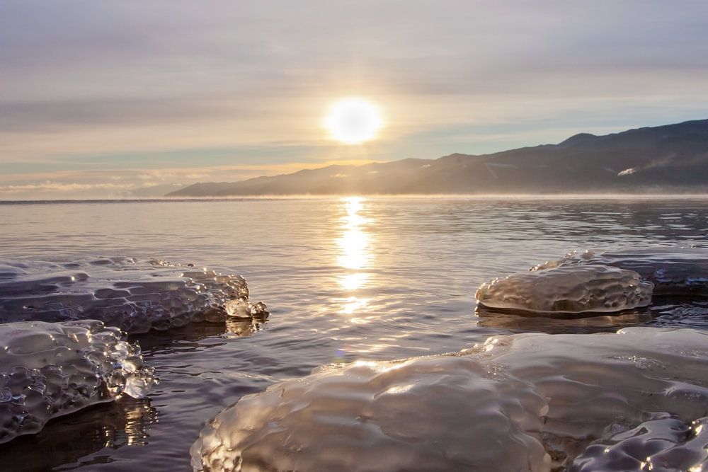 Blaues Eis, das von der Küste gefriert, und blaues Wasser, morgens auf dem herbstlichen Baikal in Sibirien