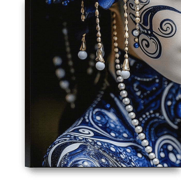 Dieses Porträt zeigt eine majestätische Figur, deren Erscheinung durch kunstvoll gestaltete, florale Ornamente und detaillierte Gesichtsbemalung geprägt ist. Das dominante Farbschema in tiefem Blau und strahlendem Weiß erzeugt eine kühle, fast ätherische Atmosphäre, die die Betrachter in ihren Bann zieht. Die floralen Elemente,…