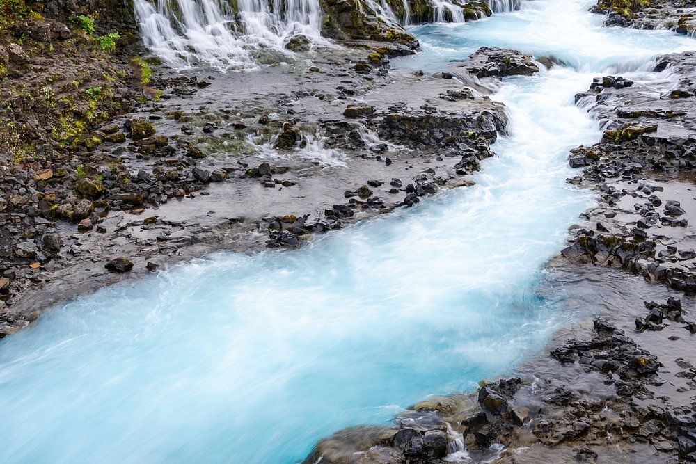 Der Brúarfoss-Wasserfall in Island. An einem Abend im Juni, als es noch lange hell ist, machte ich die Wanderung zu diesem schönen Wasserfall. Das Blau des Wassers ist wunderschön und die Form des Wasserfalls ist sehr speziell.