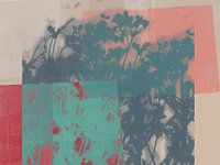 Über „Blaugrüne Blüten auf Rot, Rosa und Weiß“ von Dina Dankers