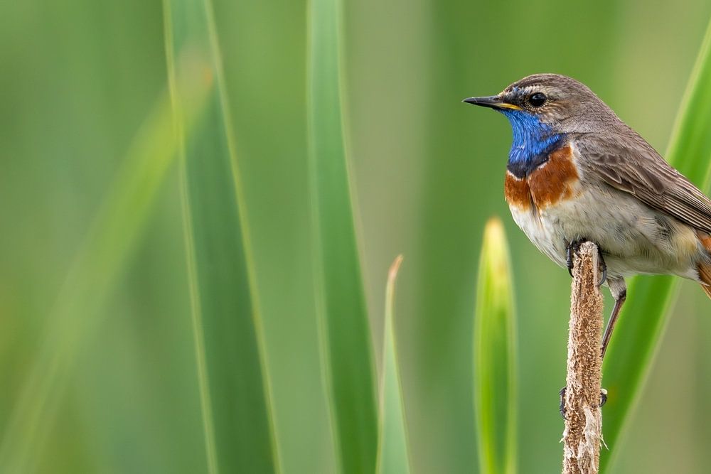 Dieses Blaukehlchen ruhte und sang herrlich auf einem Schilfrohr, vor einem schönen grünen Hintergrund mit Blättern des Rohrkolbens.