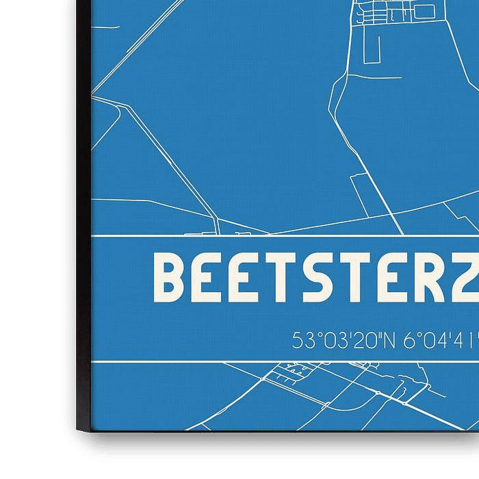Blaupause der Karte / Karte der niederländischen Stadt Beetsterzwaag, in der Gemeinde Opsterland, Provinz Fryslan. Die Karte enthält alle öffentlichen Straßen und die Koordinaten des Zentrums von Beetsterzwaag.