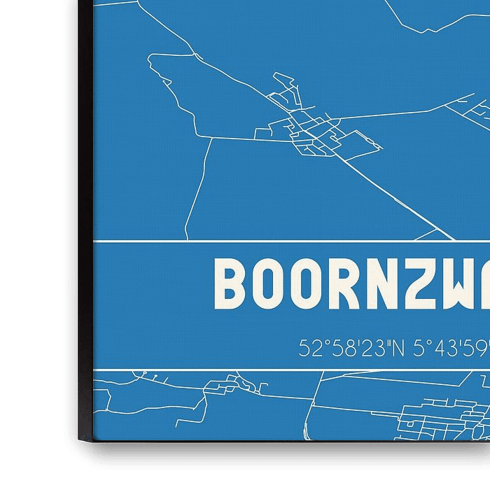 Blaupause der Karte / Karte der niederländischen Stadt Boornzwaag, gelegen in der Gemeinde De Fryske Marren, Provinz Fryslan. Die Karte enthält alle öffentlichen Straßen und die Koordinaten des Zentrums von Boornzwaag.