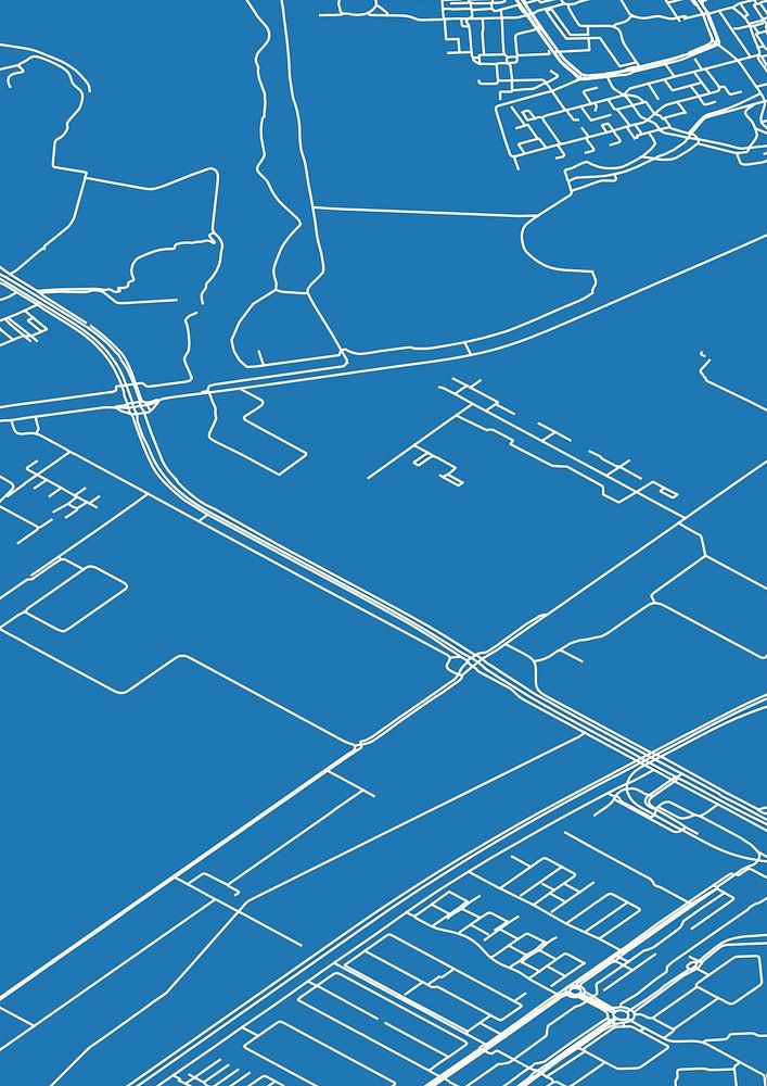 Blaupause der Karte / Karte der niederländischen Stadt Cruquius, gelegen in der Gemeinde Haarlemmermeer, Provinz Nordholland. Die Karte enthält alle öffentlichen Straßen und die Koordinaten des Zentrums von Cruquius.