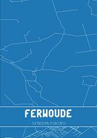 Blaupause der Karte / Karte der niederländischen Stadt Ferwoude, gelegen in der Gemeinde Sudwest-Fryslan, Provinz Fryslan. Die Karte enthält alle öffentlichen Straßen und die Koordinaten des Zentrums von Ferwoude.
