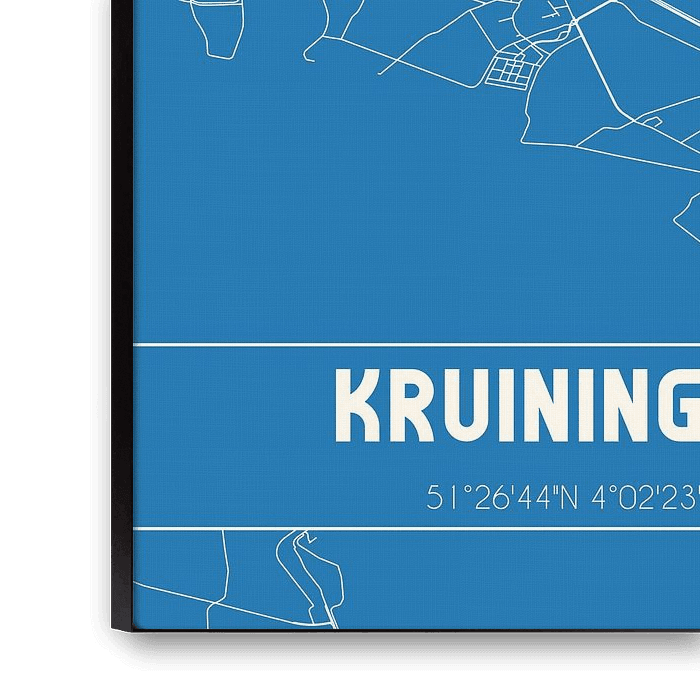 Blaupause der Karte / Karte der niederländischen Stadt Kruiningen, gelegen in der Gemeinde Reimerswaal, Provinz Zeeland. Die Karte enthält alle öffentlichen Straßen und die Koordinaten des Zentrums von Kruiningen.
