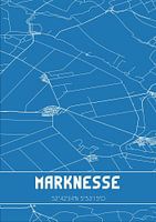 Blaupause der Karte / Karte der niederländischen Stadt Marknesse, gelegen in der Gemeinde Noordoostpolder, Provinz Flevoland. Die Karte enthält alle öffentlichen Straßen und die Koordinaten des Zentrums von Marknesse.