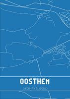 Blaupause der Karte / Karte der niederländischen Stadt Oosthem, gelegen in der Gemeinde Sudwest-Fryslan, Provinz Fryslan. Die Karte enthält alle öffentlichen Straßen und die Koordinaten des Zentrums von Oosthem.