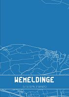 Blaupause der Karte / Karte der niederländischen Stadt Wemeldinge, gelegen in der Gemeinde Kapelle, Provinz Zeeland. Die Karte enthält alle öffentlichen Straßen und die Koordinaten des Zentrums von Wemeldinge.