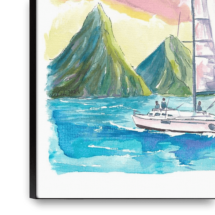 Blick auf Gros Piton und Petit Piton vom Meer aus bei Sonnenuntergang