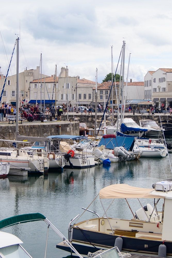 Blick auf den Hafen von Saint-Martin-de-Ré auf der île de Ré mit Booten und Spaziergängern an einem sonnigen Sommertag