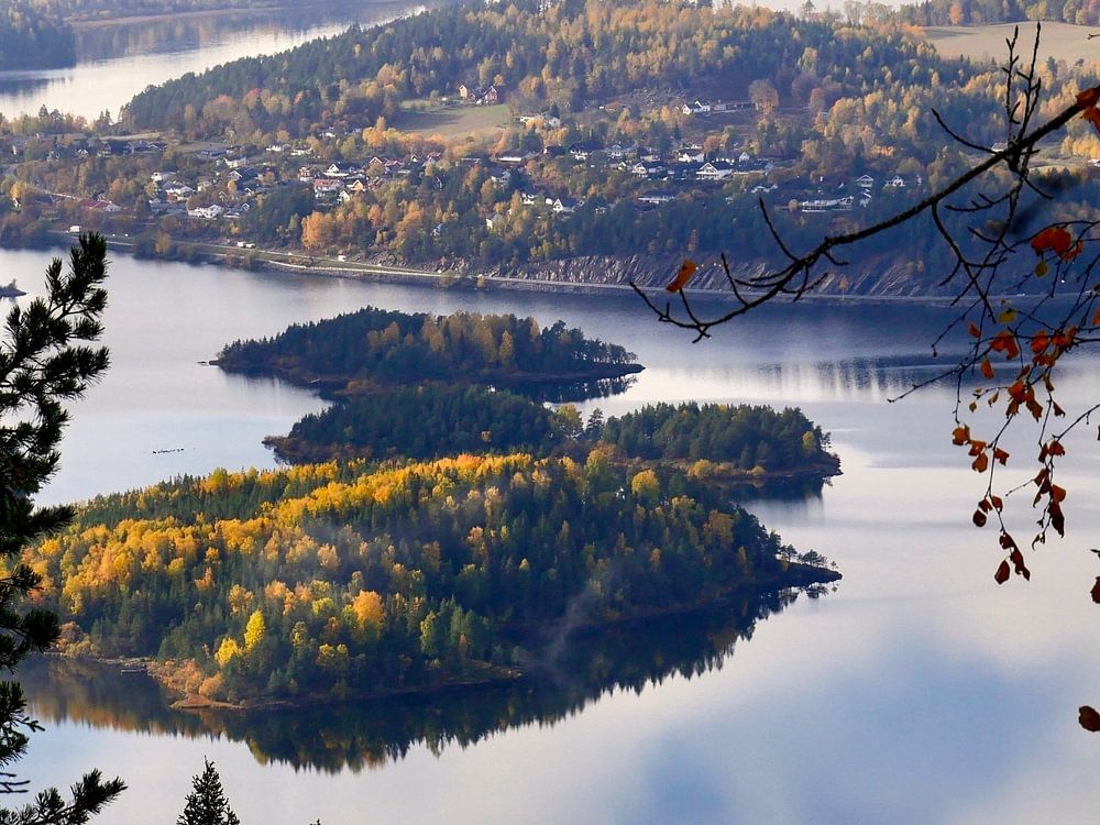 Etwa eine Autostunde von Oslo entfernt befindet sich das Naturschutzgebiet Mørkgongna. Hier kann man wunderschön wandern und dabei unter anderem diese Aussichten in großer Höhe erleben. Natürlich haben Sie schon einige Stunden mit dem Klettern verbracht, aber sagen Sie selbst, das ist eine wahnsinnige Belohnung für die harte Arbeit, nicht wahr? Sie blicken über den Steinisfjord, in dem einige kleine Inseln zu sehen sind. Wenn die Sonne scheint, ist es schön, dies für eine Weile zu genießen.