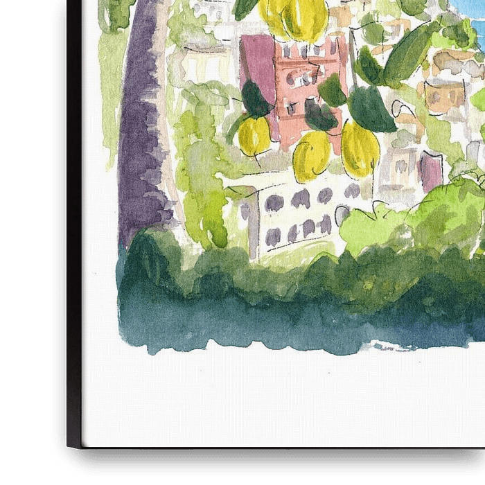 Bestelle diese Malerei Blick auf die Amalfiküste mit Zitronenbaumgarten von Markus Bleichner als Reproduktion auf Leinwand, Alu-Dibond, als Poster, Fototapete oder Acrylglasbild.