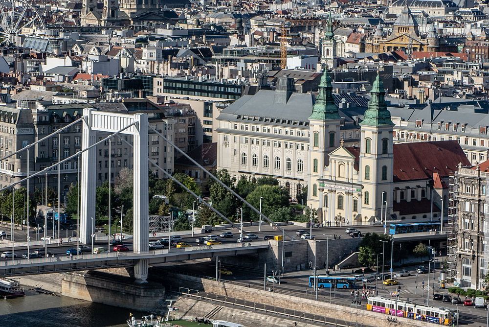 Blick auf die Elisabethbrücke und die Pfarrkirche in der Innenstadt von Budapest