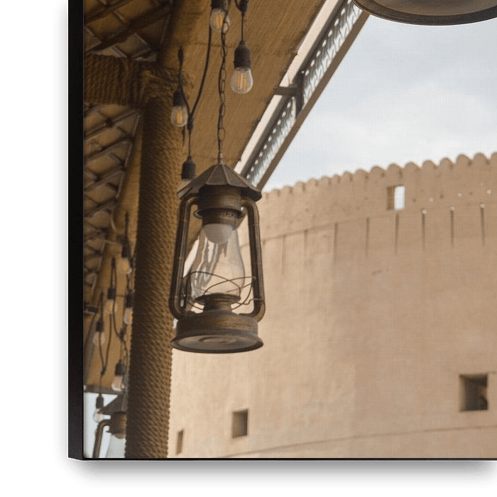 Bestelle das Foto Blick auf die Festung von Nizwa vom Athar Café von Lisette van Leeuwen als Reproduktion auf Leinwand, Alu-Dibond, als Poster, Fototapete oder Acrylglasbild.