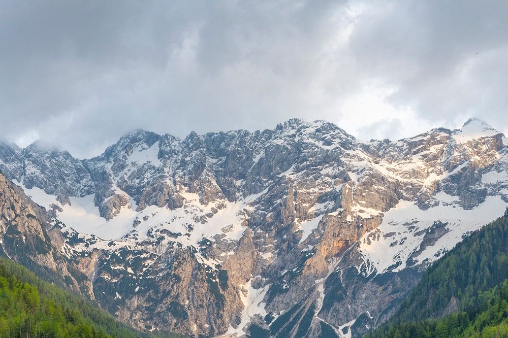 Blick auf das Zgornje Jezersko-Tal in Slowenien an einem schönen Frühlingstag mit der Bergkette um den Grintovec-Gipfel in den Kamnik-Savinja-Alpen.
