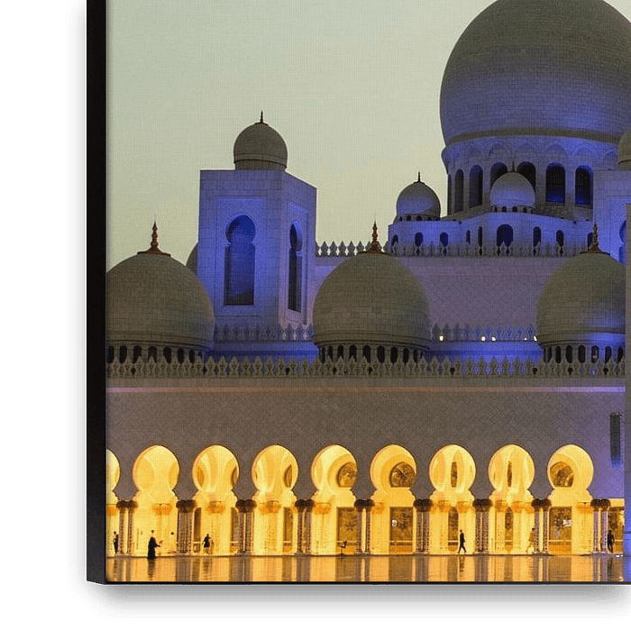Bestelle das Foto Blick auf die blau beleuchtete Große Scheich-Zayed-Moschee am Abend in Abu Dhabi, Vereinigte Arabisc von WorldWidePhotoWeb als Reproduktion auf Leinwand, Alu-Dibond, als Poster, Fototapete oder Acrylglasbild.