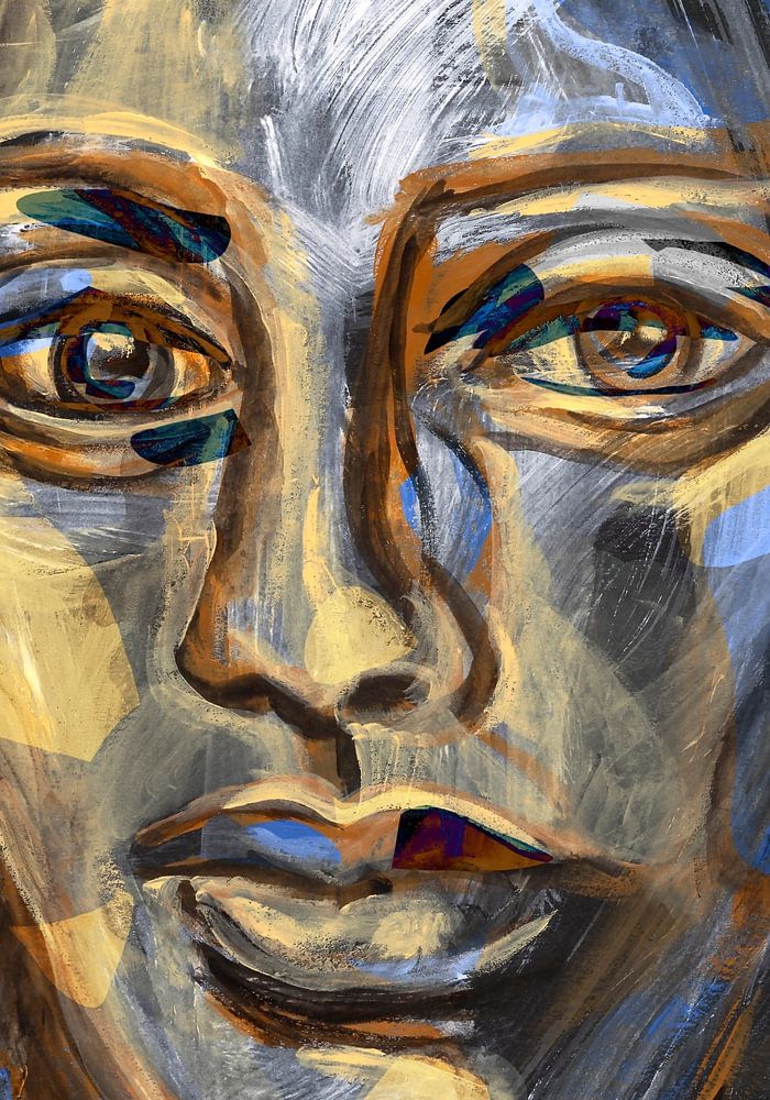 Porträt mit einem offenen, intensiven Blick. Ich habe Acrylfarbe in warmen und kühlen Farben auf einem schwarzen Hintergrund verwendet. Die Pinselstriche sind lebendig und intuitiv.