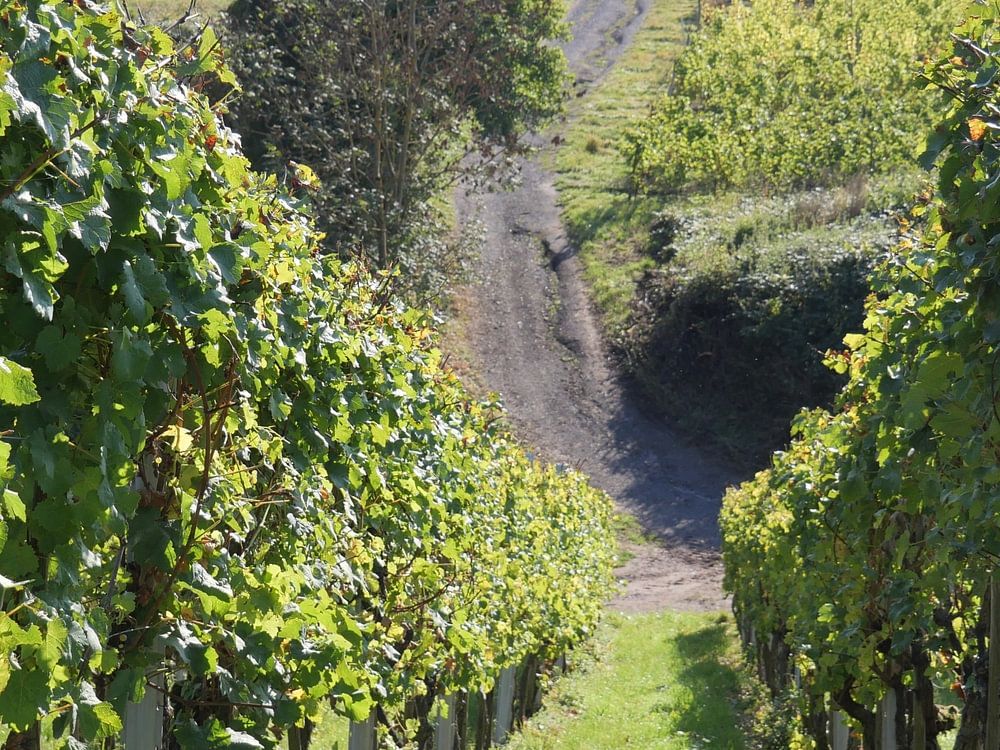 Ein Blick in die luxemburgischen Weinberge, mit sanften Hügeln und Blicken auf Trauben, die sich im Herbst der Reife nähern.