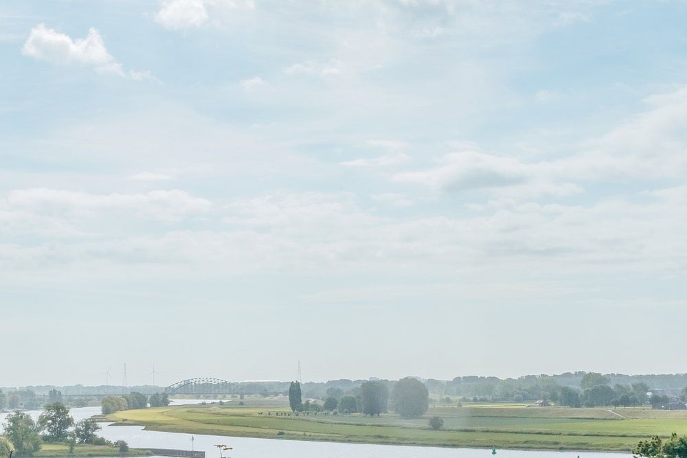 Vom Landgoed Duno aus haben Sie einen herrlichen Blick auf den Niederrhein mit Arnheim in der Ferne. Ein atemberaubender Blick auf die Flusslandschaft am Fuße der Veluwe-Seitenmoräne. Das Foto habe ich bei einem Spaziergang im Sommer 2022 auf dem Holzschuhpfad Dorenweertsepad aufgenommen. Vom Schloss Doorwerth aus führt der Weg über die Seitenmoräne und bietet schöne Ausblicke auf das Wasser.