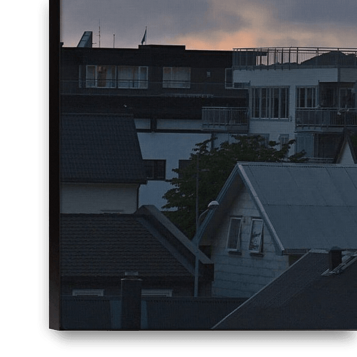 Bestelle das Foto Blick über die Dächer von Svolvær, Lofoten, Norwegen in der Abenddämmerung von Timon Schneider als Reproduktion auf Leinwand, Alu-Dibond, als Poster, Fototapete oder Acrylglasbild.
