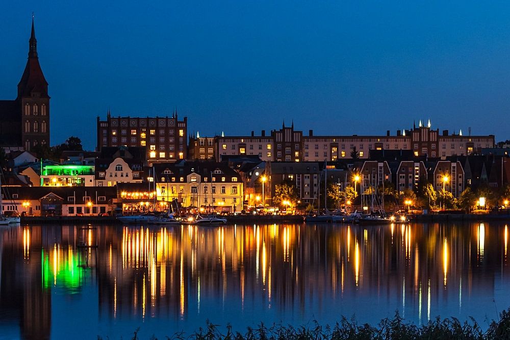 Blick über die Warnow auf die Hansestadt Rostock bei Nacht.