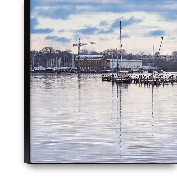 Bestelle das Foto Blick über die Warnow auf die Hansestadt Rostock im Winter von Rico Ködder als Reproduktion auf Leinwand, Alu-Dibond, als Poster, Fototapete oder Acrylglasbild.