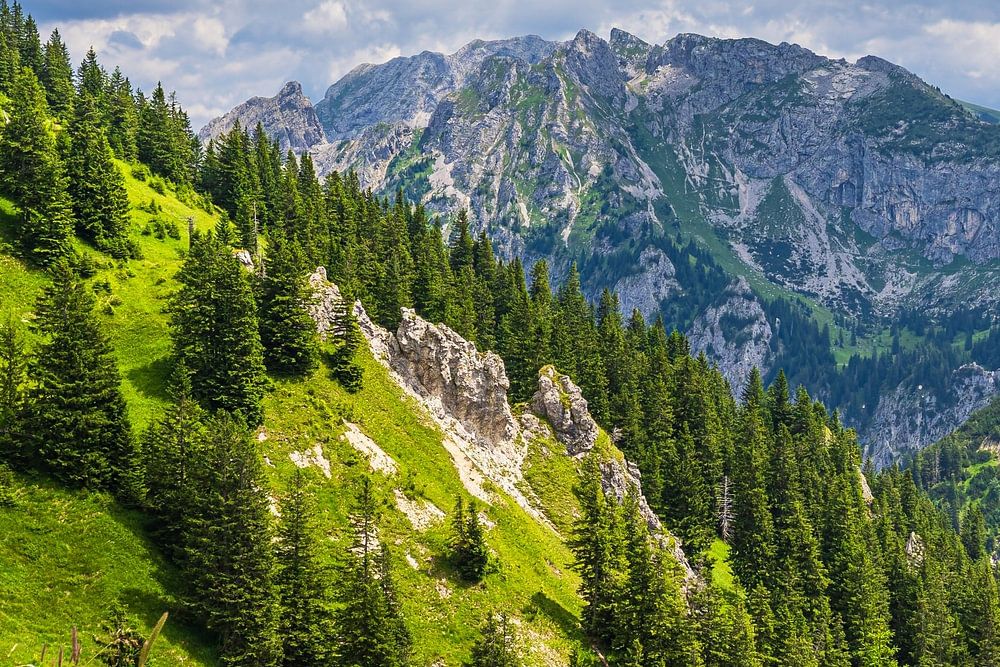 Blick vom Tegelberg bei Schwangau auf die Alpen.