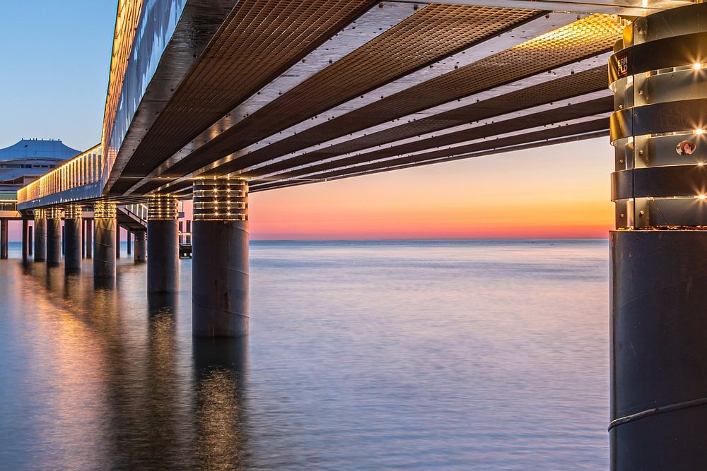 An einem Tag im März 2022 wurde schönes Wetter vorausgesagt. Ich hatte sofort das japanisch wirkende Teehaus auf der Ostsee und die schön beleuchtete Seebrücke, die eine große moderne architektonische Bauart zu bieten hat, im Kopf. Der Sonnenaufgang und die Lichtstimmung war optimal. So konnte ich mit Blende 13 und Iso 1oo eine schöne Langzeitbelichtung und einen tiefen Blickwinkel, fertig stellen. Für mich hat dieses Bild eine besondere Atmosphäre und eine futuristische Ausstrahlung.